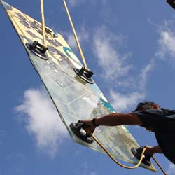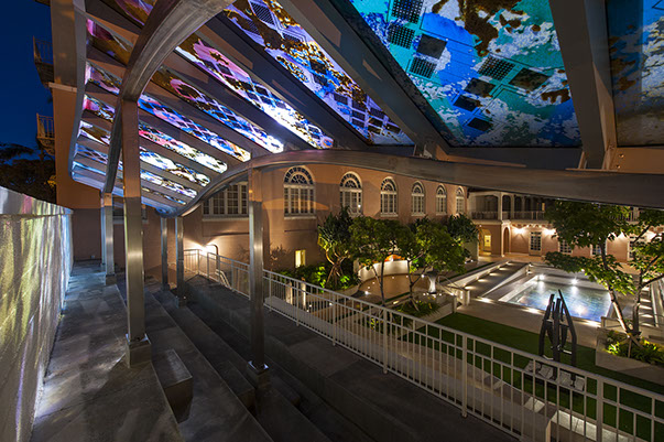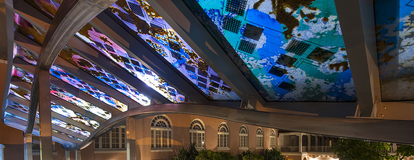 Description: Canopy shelters from the sun and plays with natural light: transparent, colored and opaque glass project patterns upon the Sculpture Garden walls, stairs and patrons and changes throughout the day. Solar cells collect energy that is fed into Museum Mainframe and assist in powering flood light that illuminate the canopy by night.