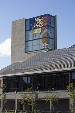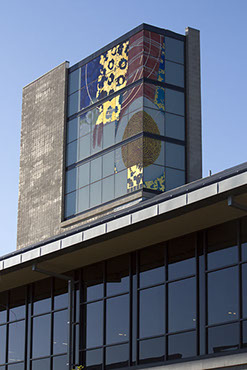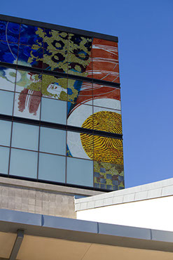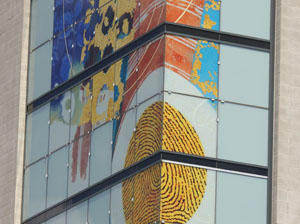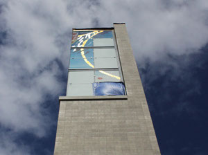 Function: The Glass Tower is in the heart of campus and easily used for way-finding, from both near and far. By day it is a reverse painting on glass, the reflective qualities of gold leaf, glass beads and the frosted glass catch natural light and cloud's movement. By night it becomes a beacon that illuminates from within and changes upon the hour. Cycles uses a uses a vocabulary of simple, abstract circular organic and geometric shapes that symbolize personal, community and generational relationships to the University