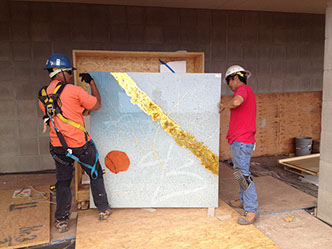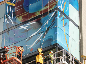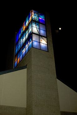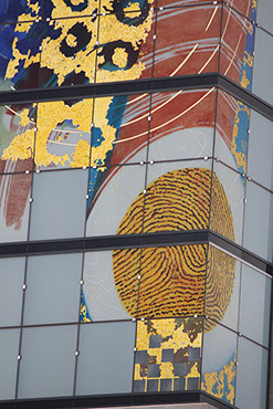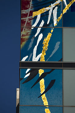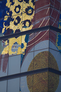 Medium: Colored vitreous enamels fired on float glass, gold leaf and silver leaf, and L.E.D. lights with computerized components including an astronomical clock moving night time illumination.